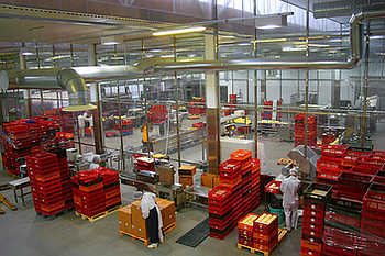 Interjöör on sama hele kui maja välisilme, päevavalgust hoovab ruumi katusekonstruktsioonide alt. Töötajad on kõik varustatud teadagi rangete valgete kostüümidega, valged mütsid peas ja kingad jalas. Pakkimise ja laadimise ruum on eraldatud läbipaistva klaasseinaga, mis muudab siseruumi maksimaalselt avaraks ja ebatehaslikult valgusküllaseks.